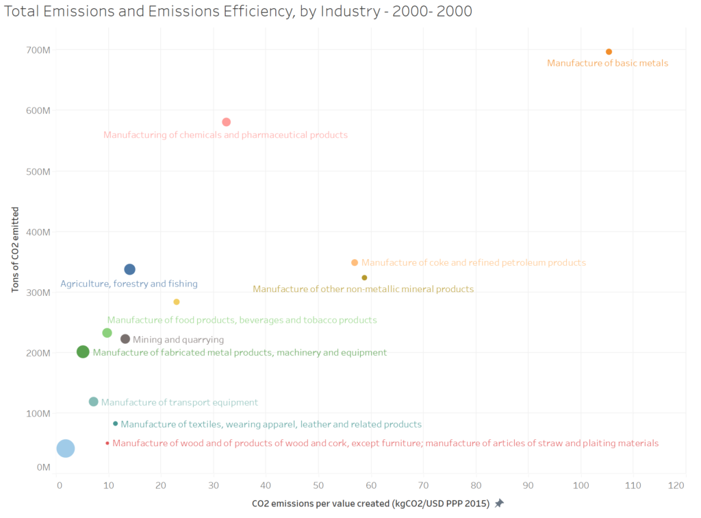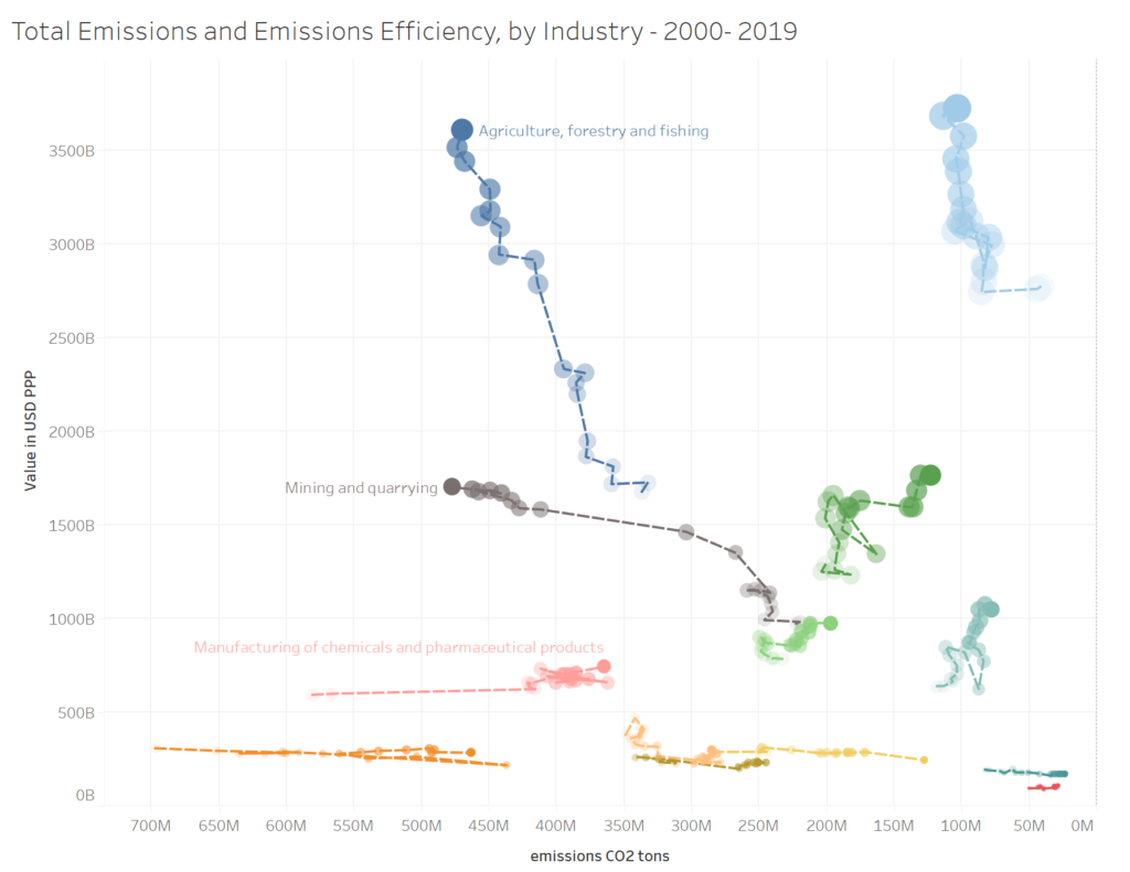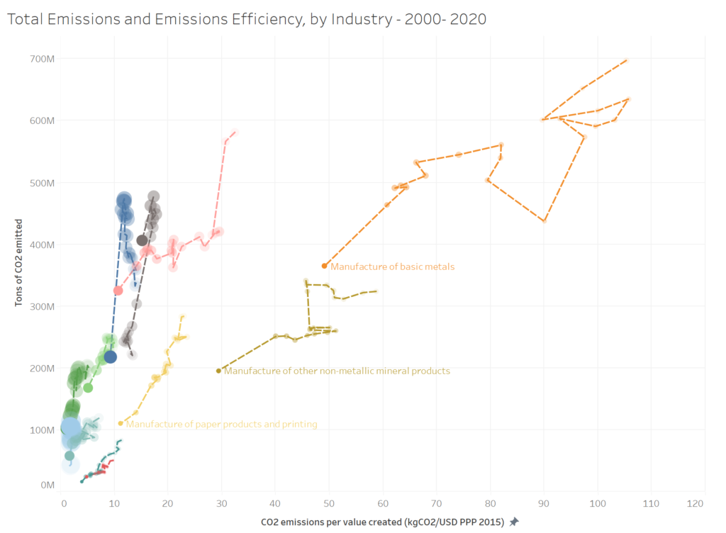 Looking at the evolution of this relationship over the past two decades, we see both promising and concerning trends. On the positive side, many industries have become more efficient, producing more economic value with fewer emissions.