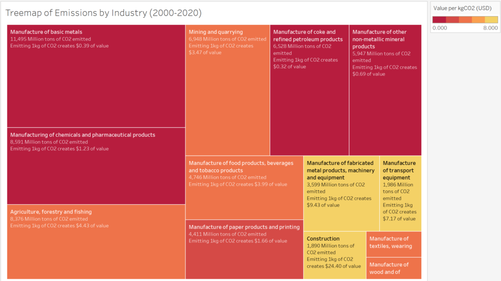 A treemap visualization reinforces this, showing that industries like construction, despite their high value creation, have much lower emissions compared to others.